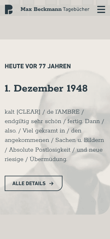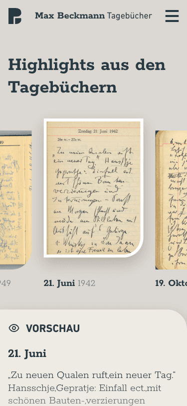 Die Online-Edition ist eine digitale Editions- und Forschungsplattform für die Tagebücher des Künstlers Max Beckmann. Die Plattform macht historische Originalquellen in Form von Faksimiles, Transkriptionen und strukturierten Metadaten online zugänglich und unterstützt sowohl das fortlaufende Lesen als auch die gezielte inhaltliche Recherche.